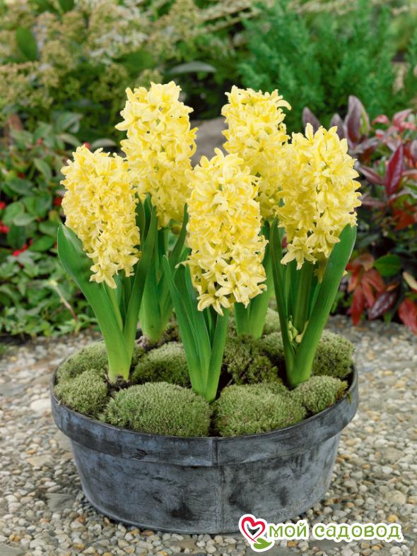 Этот привлекательный крупноцветковый сорт, представленный садоводческому миру в 1991 году. Название в переводе на русский язык звучит как «Цыганская принцесса». Многолетник отлично смотрится в саду и хорошо сочетается с другими растениями. Купить недорого качественный посадочный материал можно в нашем интернет-магазине. Как выглядит растение? Многолетник достигает в высоту 15 – 30 см. Цветение длится 13 – 18 дней. Соцветия плотные, цилиндрической формы, длиной 20 – 30 см. Размещены они на мясистых стеблях. Цветки очень ароматные. Раскрываются они с начала до середины весны. Форма колокольчатая. Состоят из 6 широких лепестков, обращенных назад. Диаметр цветка равен 4 см. Лепестки окрашены в лимонно-желтый цвет. Листва гладкая, сине-зеленая, желобчатая. Она эффектно контрастирует с цветками. Применение в ландшафтном дизайне С гиацинтом Джипси Принцесс любая клумба привлечет внимание окружающих. Пышные соцветия дарят саду тепло и позитив. Сорт подходит и для коммерческого, и для декоративного выращивания. Многим нравится сажать его для выгонки. Советы по посадке и выращиванию Декоративную культуру лучше выращивать на открытом солнце. Грунт подойдет хорошо дренированный, умеренно плодородный. Слишком влажная земля противопоказана луковицам – они могут начать гнить. Уход за растением несложен. Достаточно вносить подкормки, рыхлить землю в приствольных кругах и вести борьбу с сорными травами. Во время бутонизации полезны минеральные составы (70 – 80 г на 1 м2 площади). После цветения используют препараты, насыщенные фосфором и калием. Обязательно удаляют завязи – вызревание семенных коробочек провоцирует истощение луковиц. Положительные качества гиацинта Джипси Принцесс Данный сорт обильно цветет независимо от погодных условий. Также он славится следующими ценными качествами: неприхотливость в уходе; крепкий иммунитет; тонкий аромат; универсальность в применении; доступная цена на посадочный материал. Купить недорого гиацинты можно в интернет-магазине «Мой садовод». Просто отправьте понравившийся сорт в корзину, нажав на соответствующую кнопку. Мы бережно упакуем и максимально быстро доставим Вашу покупку ТК СДЭК или почтой России. Если возникнут вопросы или сложности с оформлением заказа, наши консультанты предоставят квалифицированную помощь. Мы гарантируем высокое качество посадочного материала и дорожим мнением каждого покупателя!