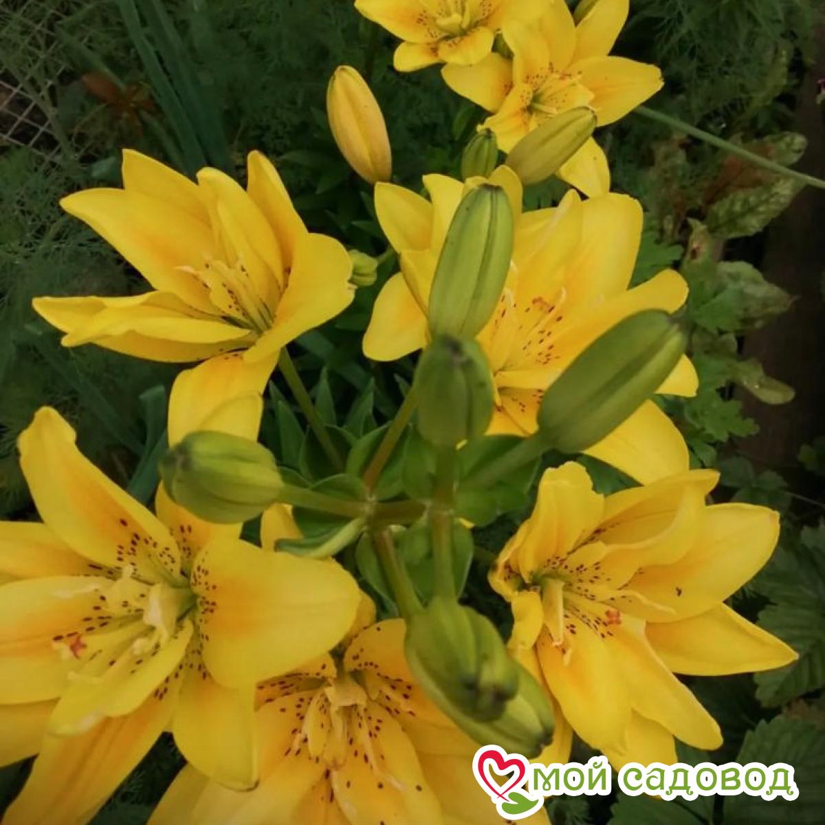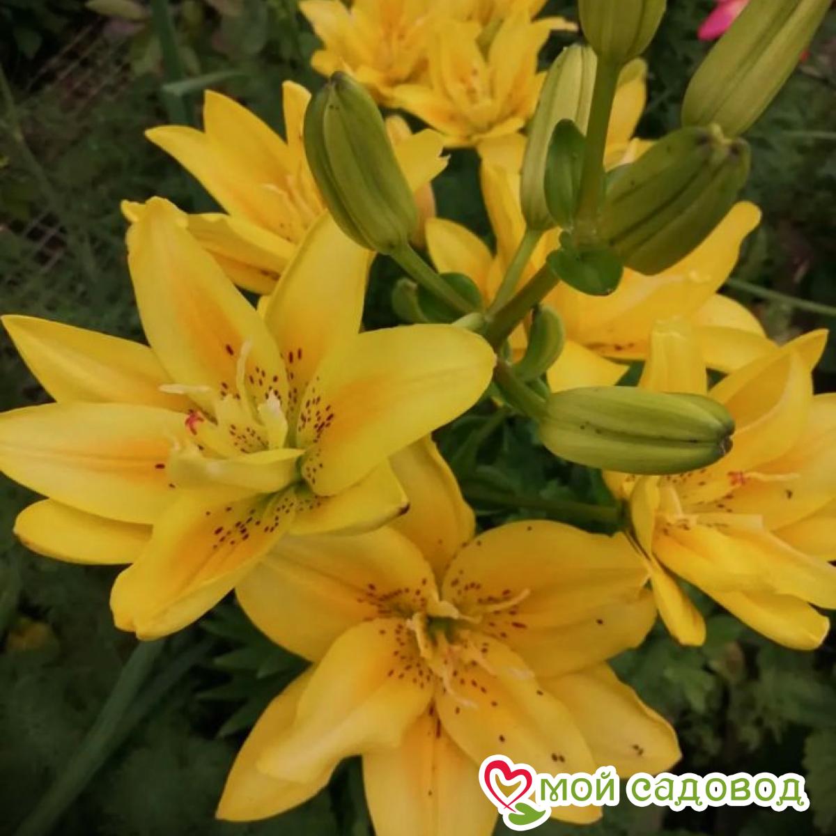 Многолетнее луковичное растение. Куст плотный, лист узкий, зеленый. Цветки махровые, лилиецветные, 17 см, воронковидные, одиночные, или собраны в пирамидальные соцветия, расположены на конце цветоноса, лепестки цветка восковидной фактуры. Цветение обильное и продолжительное, декоративность сохраняется до конца осени. Высота растений 1,20 м, окраска цветка ярко-желтая, пыльники светлые, бордовый крап. Уход за лилиями включает в себя прополки, поливы, рыхления, подкормки, борьбу с болезнями и вредителями. Поливают лилии в период цветения, поддерживая почву в увлажненном состоянии. Чтобы избежать пересыхания и перегрева почву мульчируют перегноем или торфом слоем в 5-6 см. Лилии хорошо отзываются на подкормки. Первую подкормку проводят весной после схода снега, разбрасывая по поверхности почвы азотные удобрения. Во время бутонизации растения поливают растворенной в воде аммиачной селитрой, непосредственно перед цветением использую фосфорно-калийные удобрения в жидком виде, в конце лета, но не позднее середины августа, лилии подкармливают фосфором и калием. Выращивать лилии на одном месте дольше 3-4 лет крайне нежелательно: луковица нарастает, становится рыхлой, растениям становится тесно по соседству. На 5 -6 год заметно снижается высота цветоноса, количество бутонов и значит, луковица истощена, а это может привести к заболеваниям и гибели растения. Осенью, когда надземная часть растения отмерла, стебель обрезают на высоте 15 см от поверхности почвы, гнездо выкапывают целиком, отделяют от материнской луковицы детки и высаживают их на доращивание. Саму материнскую луковицу пересаживают на новое место. В нашем интернет-магазине вы сможете купить Лилии Так же возможно вас заинтересуют Лилия-дерево Пурпл Принц и Лилия (ЛО-гибрид) Пинк Хевен